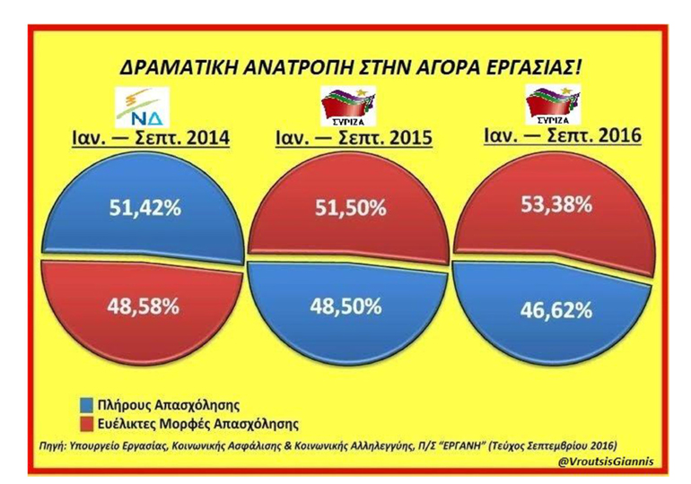 Ι. Οι ευέλικτες μορφές απασχόλησης τη διετία 2015-2016 (περίοδος διακυβέρνησης ΣΥΡΙΖΑ-ΑΝΕΛ) έσπασαν το ιστορικό φράγμα του 50% και ξεπέρασαν την πλήρη απασχόληση, σε αντίθεση με ό,τι συνέβαινε το 2014 και όλα τα προηγούμενα χρόνια. Ειδικότερα την περίοδο Ιαν.-Σεπτ. 2015 οι ευέλικτες μορφές απασχόλησης αντιστοιχούσαν στο 51,50%, έναντι 48,50% της πλήρους απασχόλησης. Την αντίστοιχη περίοδο Ιαν.-Σεπτ. 2016 τα ποσοστά των ευέλικτων μορφών απασχόλησης διευρύνθηκαν ακόμη περισσότερο, φθάνοντας το 53,38%. Αντίστοιχα τα ποσοστά της πλήρους απασχόλησης υποχώρησαν περαιτέρω στο 46,62%, όπως εξήγησε ο κοινοβουλευτικός εκπρόσωπος της ΝΔ.