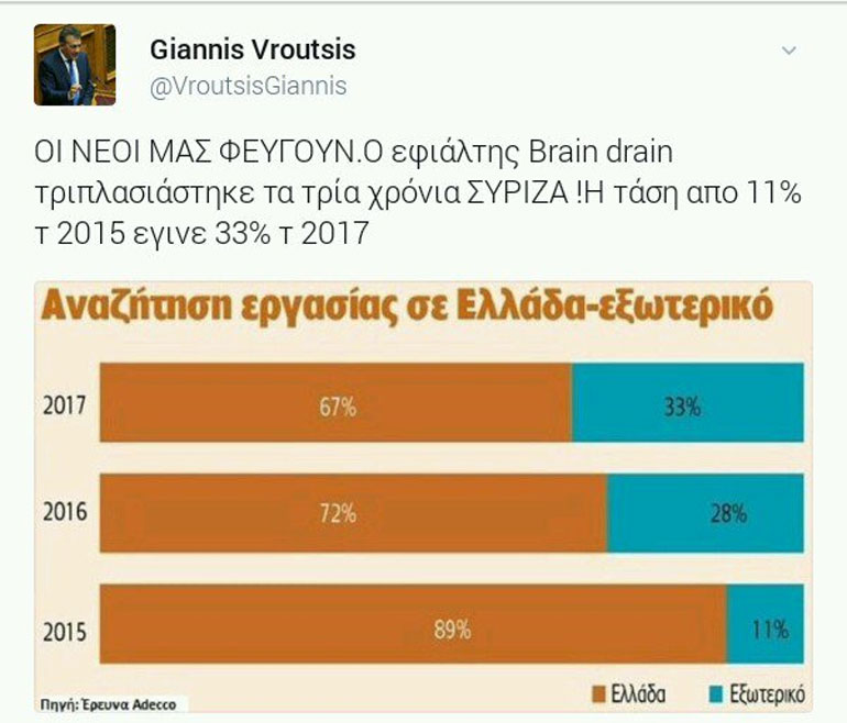 Με σχετική ανάρτηση στον προσωπικό του λογαριασμό στο Twitter, ο πρώην Υπουργός Εργασίας, έγραψε χαρακτηριστικά: «Οι νέοι μας, φεύγουν. Ο εφιάλτης Brain drain τριπλασιάστηκε σε τρία χρόνια ΣΥΡΙΖΑ. Η τάση από 11% έγινε 33% το 2017».