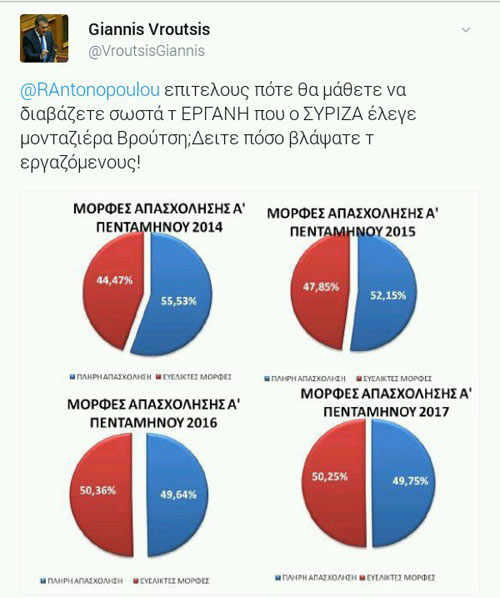Ο πρώην Υπουργός απάντησε στην κα Αντωνοπούλου υπογραμμίζοντας: «Κυρία Αντωνοπούλου, επιτέλους πότε θα μάθετε να διαβάζετε σωστά την ΕΡΓΑΝΗ, που ο ΣΥΡΙΖΑ την έλεγε «μονταζιέρα» Βρούτση; Δείτε πόσο βλάψατε τους εργαζόμενους».