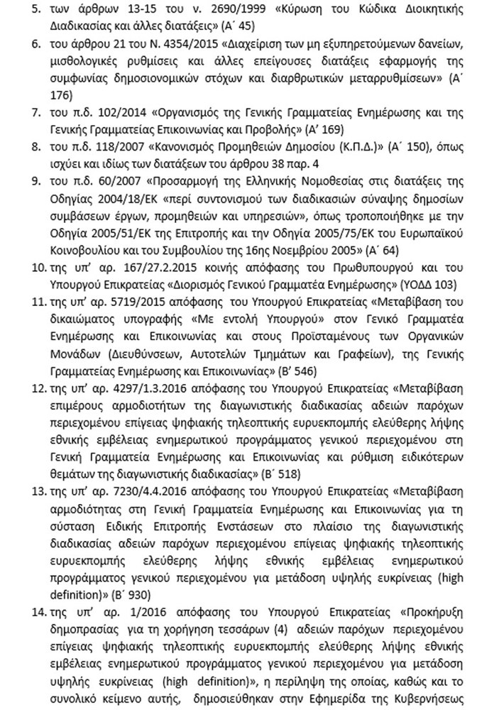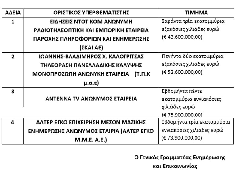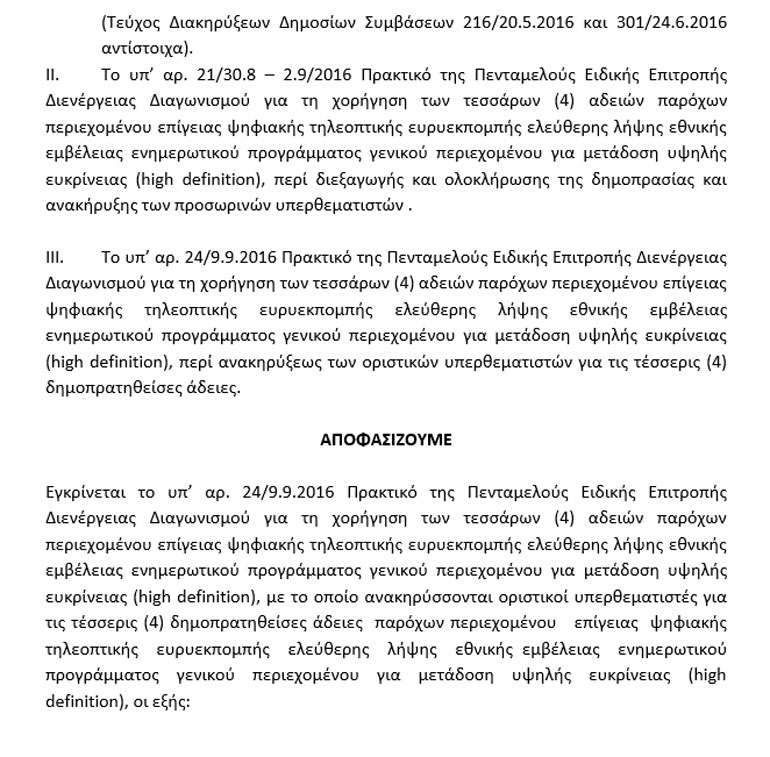 Με την υπ’ αρ. 239/9-9-2016 απόφαση του Γενικού Γραμματέα Ενημέρωσης (ΑΔΑ: 7Φ2Ξ465ΙΧΦ-9ΑΛ), ολοκληρώθηκε η διαδικασία αδειοδότησης παρόχων περιεχομένου επίγειας ψηφιακής τηλεοπτικής ευρυεκπομπής ελεύθερης λήψης εθνικής εμβέλειας ενημερωτικού προγράμματος γενικού περιεχομένου, με την οποία ανακηρύχθηκαν ως οριστικοί υπερθεματιστές οι εξής: