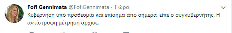 «Κυβέρνηση υπό προθεσμία και επίσημα από σήμερα, είπε ο συγκυβερνήτης», ανέφερε η κ. Γεννηματά στον λογαριασμό της στο Twitter και συμπλήρωσε: «Η αντίστροφη μέτρηση άρχισε».