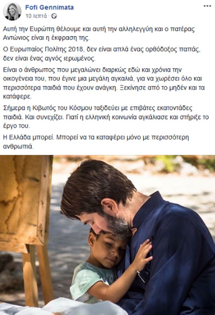 «Ο Ευρωπαίος Πολίτης 2018, δεν είναι απλά ένας ορθόδοξος παπάς, δεν είναι ένας αγνός ιερωμένος. Είναι ο άνθρωπος που μεγαλώνει διαρκώς εδώ και χρόνια την οικογένειά του, που έγινε μια μεγάλη αγκαλιά, για να χωρέσει όλο και περισσότερα παιδιά που έχουν ανάγκη. Ξεκίνησε από το μηδέν και τα κατάφερε» σημειώνει η Φ. Γεννηματά σε ανάρτησή της στο Facebook και προσθέτει: «Σήμερα η Κιβωτός του Κόσμου ταξιδεύει με επιβάτες εκατοντάδες παιδιά. Και συνεχίζει. Γιατί η ελληνική κοινωνία αγκάλιασε και στήριξε το έργο του. Η Ελλάδα μπορεί. Μπορεί να τα καταφέρει μόνο με περισσότερη ανθρωπιά».
