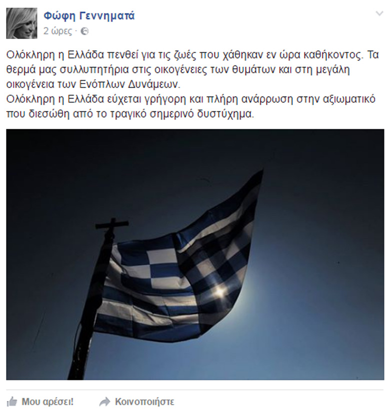 Τη θλίψη της για την τραγωδία με το ελικόπτερο εξέφρασε με ανάρτησή της στον προσωπικό της λογαριασμό στο Facebook η Φώφη Γεννηματά.