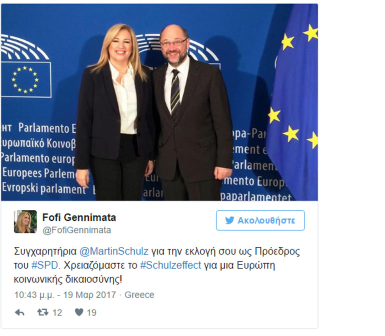 Η κα Γεννηματά ανέφερε, πως «χρειαζόμαστε το #Schulzeffect για μια Ευρώπη κοινωνικής δικαιοσύνης και τόνισε «Συγχαρητήρια @MartinSchulz για την εκλογή σου ως Πρόεδρος του SPD».