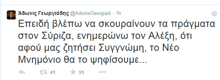 Μέσω ενός ακόμη tweet, ο Άδωνις Γεωργιάδης σχολίασε το σημερινό άρθρο του Μανώλη Γλέζου εξαπολύοντας πυρά κατά του Αλέξη Τσίπρα και λέγοντας πως, αφού ζητήσει συγγνώμη, «το Νέο Μνημόνιο θα το ψηφίσουμε».