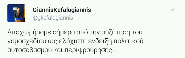 Ο Κοινοβουλευτικός Εκπρόσωπος της ΝΔ, μέσω του προσωπικού του, λογαριασμού στο Twitter, αναφερόμενος στο θέμα της αποχώρησης του κόμματός του, από την Ολομέλεια της Βουλής, υπογράμμισε: