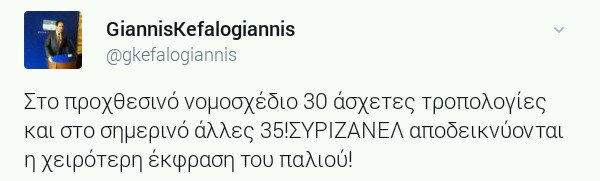 Νωρίτερα, ο κ. Κεφαλογιάννης, τόνισε: «Στο προχθεσινό νομοσχέδιο τριάντα (30) άσχετες τροπολογίες και στο σημερινό, άλλες τριάντα πέντε (35)! ΣΥΡΙΖΑΝΕΛ αποδεικνύονται η χειρότερη έκφραση του παλιού!».