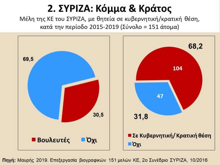 Το καταστατικό του κόμματος, στο άρθρο 27, που υποτίθεται ότι ρυθμίζει τις «σχέσεις του ΣΥΡΙΖΑ με το κράτος και την κυβέρνηση», αναφέρει στο εδάφιο 1: «1. Ο ΣΥΡΙΖΑ, ως μαζικό δημοκρατικό κόμμα της Αριστεράς, στηρίζεται στις κοινωνικές δυνάμεις και δεν εξαρτά την επιβίωσή του από κάθε είδους σχέση με τους κρατικούς μηχανισμούς». (…) και παρακάτω προβλέπει: «3. Ο ΣΥΡΙΖΑ στην περίπτωση που συμμετάσχει στη διακυβέρνηση της χώρας, διατηρεί σε κάθε περίπτωση την οργανωτική και πολιτική του αυτονομία έναντι της κυβέρνησης και του κράτους. (…) Τα στελέχη που κατέχουν αμειβόμενη κυβερνητική θέση ή αξίωμα (μέλος Υπουργικού Συμβουλίου ή μέλος ΔΣ Δημόσιου Οργανισμού / Διεθνούς Οργανισμού ή Ανεξάρτητης Αρχής / ΔΕΚΟ / ΝΠΔΔ / Γενικοί και Ειδικοί Γραμματείς Υπουργείων, Υφυπουργοί), δεν μπορεί να υπερβαίνουν το 25% των μελών κάθε οργάνου του κόμματος. Τι συνέβη, όμως, στην πραγματικότητα; Η Κεντρική Επιτροπή που εκλέχθηκε στο 2ο Συνέδριο του κόμματος, τον Οκτώβριο του 2016, αριθμεί 151 μέλη. Από αυτά, τα 104, δηλαδή 7 στα 10 (ποσοστό 68%) ανέλαβαν στην περίοδο 2015-2019 κάποια κυβερνητική/κρατική θέση (Διαγράμματα 1 και 2). Αναλυτικότερα, με βάση τις εμφανείς ιδιότητές τους, που είναι δημόσια καταγεγραμμένες, προκύπτει ότι στα μέλη της ΚΕ του κόμματος περιλαμβάνονται: 33 Υπουργοί, Υφυπουργοί και Αναπληρωτές Υπουργοί, 6 Γενικοί Γραμματείς Υπουργείων, 8 Διευθυντές πολιτικών γραφείων Υπουργών και στελέχη του Γραφείου του Πρωθυπουργού, 5 Μέλη ΔΣ Δημοσίων Οργανισμών & Επιτροπών Δημοσίου, 5 Πρόεδροι & Αντιπρόεδροι Δημοσίων Οργανισμών, 3 Διευθυντικά Στελέχη ΔΕΚΟ και 8 στελέχη Εταιριών του Δημοσίου, 9 Σύμβουλοι Υπουργών, 4 Διευθυντικά στελέχη της Αυτοδιοίκησης, 22 Βουλευτές και 1 Ευρωβουλευτής. Ας σημειωθεί ότι 23 κυβερνητικά στελέχη διαθέτουν επίσης την βουλευτική ιδιότητα. Η επικάλυψη Κεντρικής Επιτροπής και Κοινοβουλευτικής Ομάδας (ΚΟ) είναι μεγάλη, με δεδομένο ότι το 30,5% των μελών της, σχεδόν 1 στα 3, είναι και βουλευτές (Συνολικά, ο αριθμός των βουλευτών/ ευρωβουλευτών ανέρχεται σε 46 – Διάγραμμα 2).