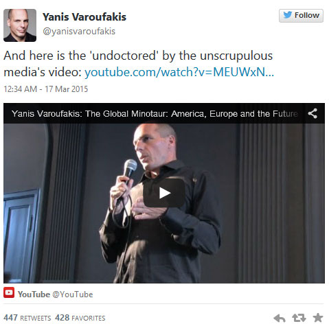 Σε δεύτερο τιτίβισμά του ο υπουργός Oικονομικών επισήμανε: «Και αυτό είναι το ‘αμοντάριστο’ βίντεο των αδίστακτων μέσων», παραθέτοντας το επίμαχο βίντεο.