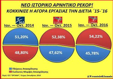 «Οι ευέλικτες μορφές απασχόλησης τη διετία 2015-2016 (περίοδος διακυβέρνησης ΣΥΡΙΖΑ-ΑΝΕΛ) όχι μόνο έσπασαν το ιστορικό φράγμα του 50%, αλλά πλέον κυριαρχούν απόλυτα στην αγορά εργασίας, ξεπερνώντας την πλήρη απασχόληση, σε αντίθεση με ό,τι συνέβαινε το 2014 και όλα τα προηγούμενα χρόνια», σημείωσε χαρακτηριστικά.