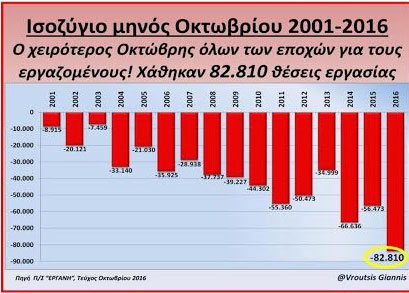 Τα στοιχεία «ΣΟΚ» για την αγορά εργασίας, του συστύματος «ΕΡΓΑΝΗ» για το μήνα Οκτώβριο 2016, φέρνει στο φως της δημοσιότητας, ο Πρώην Υπουργός Εργασίας, Γιάννης Βρούτσης. Μέσα στο δέκατο μήνα του έτους, χάθηκαν 82.810 θέσεις εργασίας, με τον κοινοβουλευτικό εκπρόσωπο της ΝΔ, να χαρακτηρίζει τον Οκτώβριο, ως τον «χειρότερο όλων των εποχών».