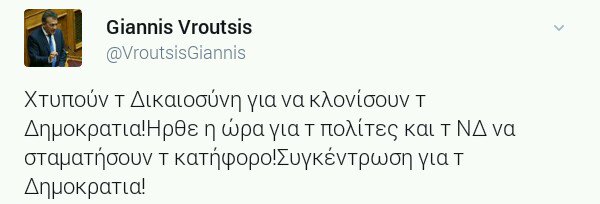 Μέσω του προσωπικού του λογαριασμού στο Twitter, ο κ. Βρούτσης, κατακρίνοντας αυστηρότητα την Κυβέρνηση, υπογράμμισε: «Χτυπούν τη Δικαιοσύνη για να κλονίσουν τη Δημοκρατία!».