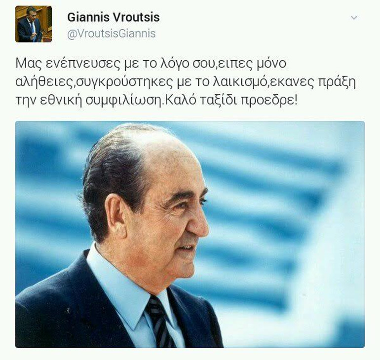 «Μας ενέπνευσες με το λόγο σου. Είπες μόνον αλήθειες. Συγκρούστηκες με το λαϊκισμό. Έκανες πράξη την εθνική συμφιλίωση. Καλό ταξίδι Πρόεδρε», έγραψε στον προσωπικό του λογαριασμό στο Twitter, ο Τομεάρχης Εργασίας, Κοινωνικής Ασφάλισης και Κοινωνικής Αλληλεγγύης της Νέας Δημοκρατίας, Βουλευτής Κυκλάδων, Γιάννης Βρούτσης, για την απώλεια του Επιτίμου Προέδρου της ΝΔ, Κωνσταντίνου Μητσοτάκη.