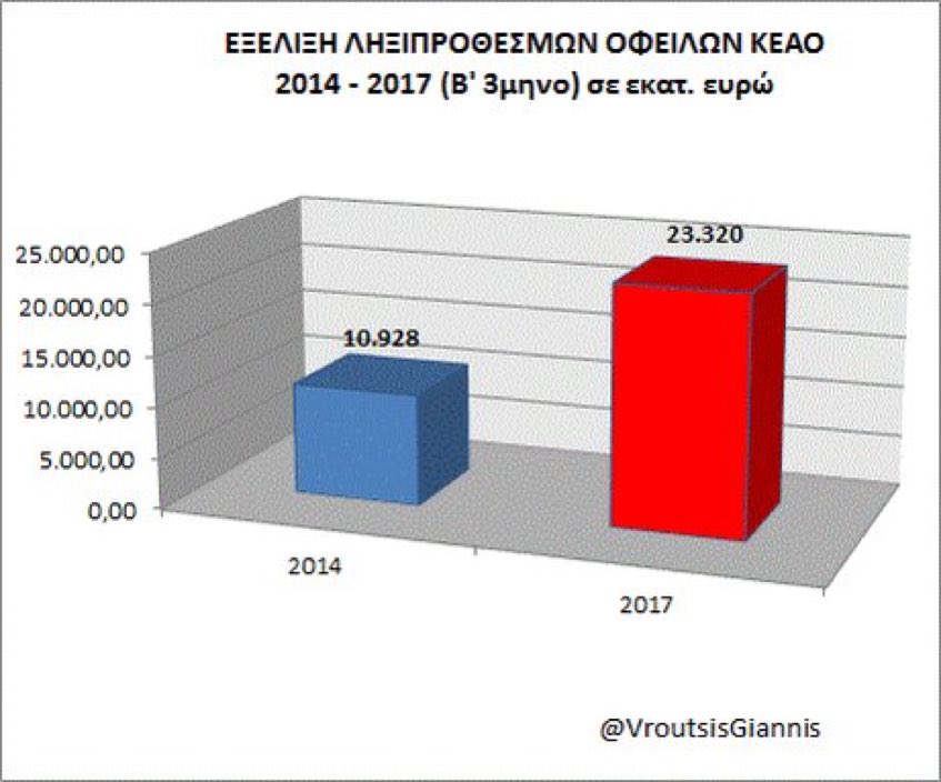 · Συγκρίνοντας την εικόνα των ληξιπροθέσμων στο ΚΕΑΟ το 2014, με την αντίστοιχη σημερινή, η συνολική αύξηση των ληξιπροθέσμων μέσα σε 2,5 χρόνια με Κυβέρνηση ΣΥΡΙΖΑ – ΑΝΕΛ, εκτινάχθηκε κατά 113 %!!!