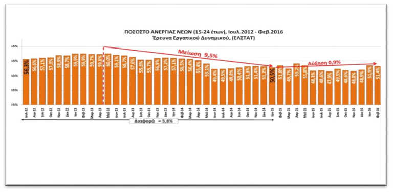 Οι νέοι έπεσαν και αυτοί θύματα της αριστερής ιδεοληψίας και ανικανότητας της κυβέρνησης ΣΥΡΙΖΑ-ΑΝΕΛ. Με τον ερασιτεχνισμό της οδήγησε ξανά σε αύξηση της ανεργίας των νέων. Τον Φεβρουάριο του 2016 το ποσοστό αυτής άγγιξε το 51,4% , παρουσιάζοντας αύξηση κατά 0,9%! Υπογραμμίζεται ότι η Ν.Δ. τον Ιανουάριο του 2015 είχε καταφέρει να μειώσει την ανεργία στο 50,5 %, δηλαδή μείωση κατά 9,5%.