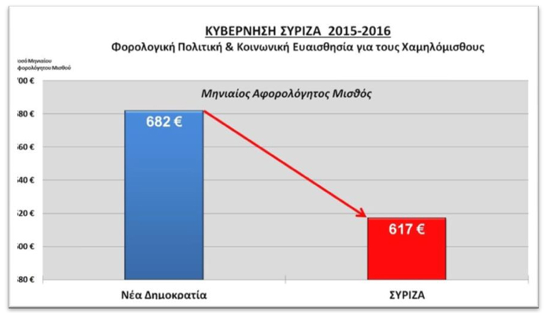 Η ΝΔ έμπρακτα υπήρξε πιο κοντά τόσο στους κοινωνικά ασθενέστερους συμπολίτες μας, όσο και στους εργαζόμενους, καθώς μείωσε 6 μονάδες τις εισφορές, διατήρησε το αφορολόγητο και μείωσε εισφορά αλληλεγγύης και ΦΠΑ. Την ώρα που ο αφορολόγητος μισθός επί Ν.Δ. ήταν στα 682 ευρώ, οι ΣΥΡΙΖΑ-ΑΝΕΛ υπόσχονταν έσοδα από τη φοροδιαφυγή και το λαθρεμπόριο. Τελικά, φορολόγησαν τους μισθούς των 617 ευρώ!