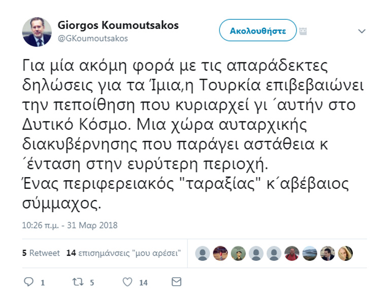 «Για μία ακόμη φορά με τις απαράδεκτες δηλώσεις για τα Ίμια, η Τουρκία επιβεβαιώνει την πεποίθηση που κυριαρχεί γι’ αυτήν στον Δυτικό Κόσμο. Μια χώρα αυταρχικής διακυβέρνησης που παράγει αστάθεια και ένταση στην ευρύτερη περιοχή. Ένας περιφερειακός “ταραξίας” και αβέβαιος σύμμαχος», τόνισε ο τομεάρχης Εξωτερικών της Νέας Δημοκρατίας Γιώργος Κουμουτσάκος με ανάρτησή του στο twitter, απαντώντας στη νέα τουρκική πρόκληση για τα Ίμια.