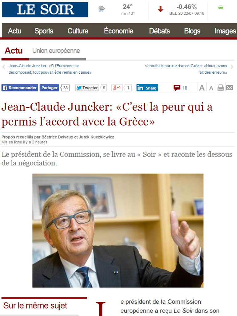 «Για πρώτη φορά ο Ζαν Κλοντ Γιούνκερ δίνει την δική του εκδοχή αναφορικά με την συμφωνία των Βρυξελλών» αναφέρει η βελγική εφημερίδα «Le Soir» όπου έδωσε συνέντευξη ο πρόεδρος της Κομισιόν.