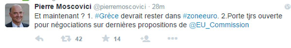 «Σε αυτούς που αναρωτιούνται θα γίνει, 1. Η Ελλάδα θα πρέπει να μείνει στο ευρώ 2. Η πόρτα είναι ανοιχτή για διαπραγματεύσεις στις τελευταίες προτάσεις της Επιτροπής».