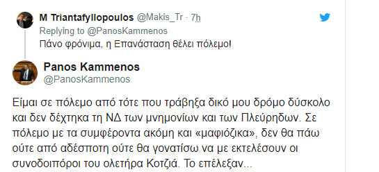 Συγκεκριμένα, απαντώντας σε σχόλιο του δημοσιογράφου Μάκη Τριανταφυλλόπουλου, ο Πάνος Καμμένος έγραψε στο Twitter: