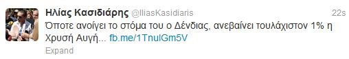 Ο εκπρόσωπος τύπου της Χρυσής Αυγής έγραψε στο twitter: «Όποτε ανοίγει το στόμα του ο Δένδιας, ανεβαίνει τουλάχιστον 1% η Χρυσή Αυγή».