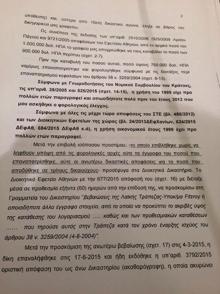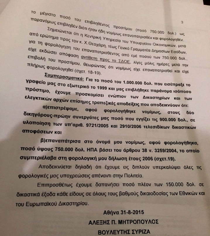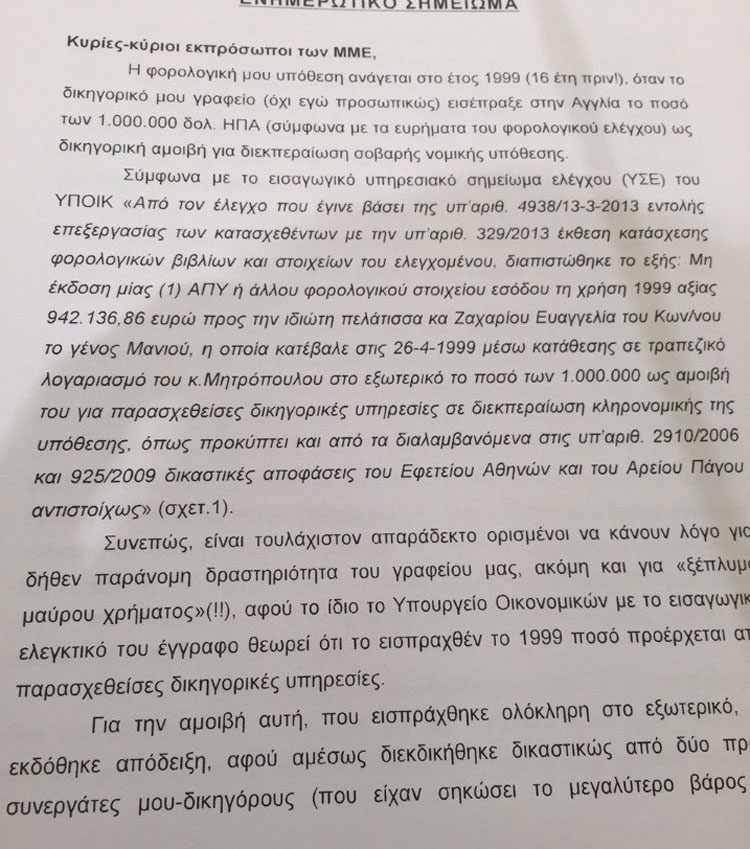 «Στο δικηγορικό μου γραφείο παρέλαβαν -όχι εγώ- το ποσόν του 1 εκατ. δολαρίων ΗΠΑ ως δικηγορική αμοιβή για περαίωση υπόθεσης. Αφορούν παρασχεθείσες υπηρεσίες κληρονομικής υπόθεσης, όπως προκύπτει… από τις δικαστικές αποφάσεις» τόνισε ο κ. Μητρόπουλος.