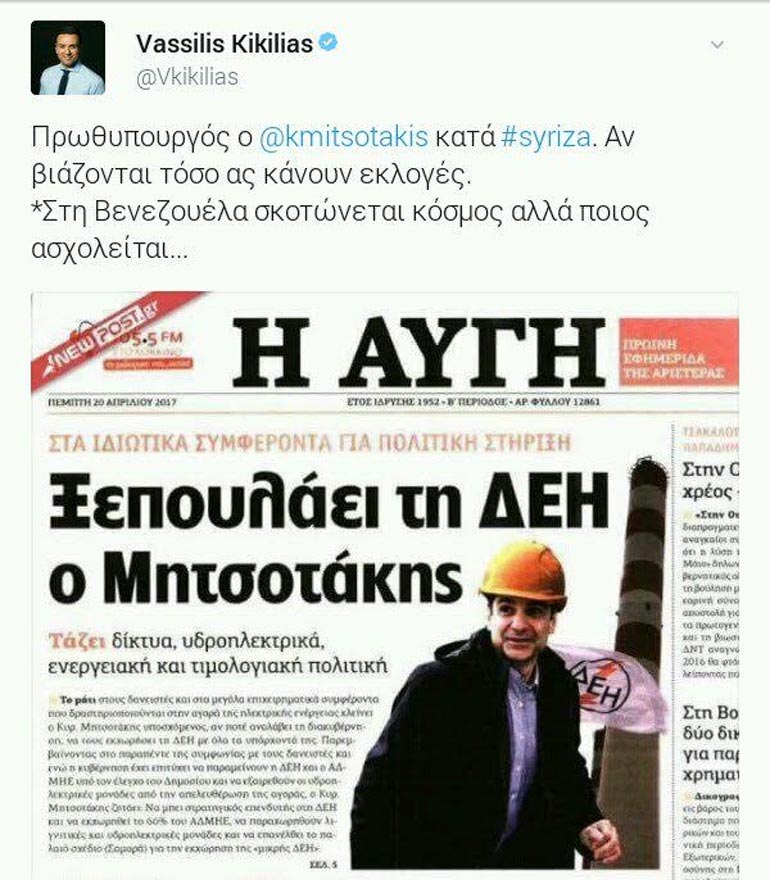 Άμεση ήταν η αντίδραση του Εκπροσώπου Τύπου της Νέας Δημοκρατίας, Βουλευτής Α΄ Αθηνών, Βασίλη Κικίλια, για το σημερινό πρωτοσέλιδο της εφημερίδας ΑΥΓΗ. Μέσω του προσωπικού του λογαριασμού στο Twitter, ο κ. Κικίλιας, έγραψε: