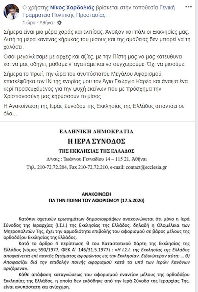 Η Ανακοίνωση της Ιεράς Συνόδου της Εκκλησίας της Ελλάδος απαντάει σε όλα…», σημειώνει Νίκος Χαρδαλιάς δημοσιεύοντας την ανακοίνωση της Ιεράς Συνόδου για τους αφορισμούς Αμβρόσιου.