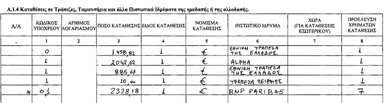 Επίσης, για το 2013 ο Πρόεδρος της Δημοκρατίας έχει δηλώσει υπόλοιπο καταθέσεων περίπου 170 ευρώ, ενώ η σύζυγός του λιγότερα από 1.200 ευρώ. Το 2014, ο κ. Παυλόπουλος δηλώνει υπόλοιπο καταθέσεων 1.458 ευρώ στην Εθνική και έναν κοινό λογαριασμό με τη σύζυγό του 2.328,18 ευρώ. Η σύζυγός του έχει υπόλοιπο καταθέσεων 2.938 ευρώ.