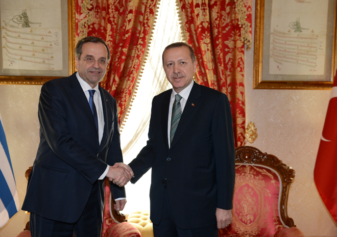 Η συνάντηση του Αντώνη Σαμαρά με τον Τούρκο ομόλογό του Ρετζέπ Ταγίπ Ερντογάν πραγματοποιήθηκε στις 11.00 στο πρωθυπουργικό γραφείο στα ανάκτορα του Ντολμάμπαχτσε, κάτω από αυστηρά μέτρα ασφαλείας.