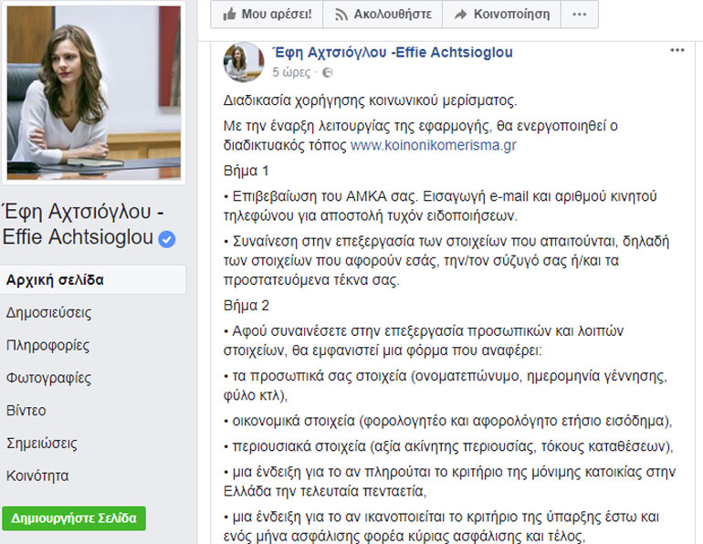 Τη διαδικασία χορήγησης κοινωνικού μερίσματος περιγράφει η υπουργός Εργασίας Έφη Αχτσιόγλου, με ανάρτηση στο προσωπικό της λογαριασμό στο facebook.