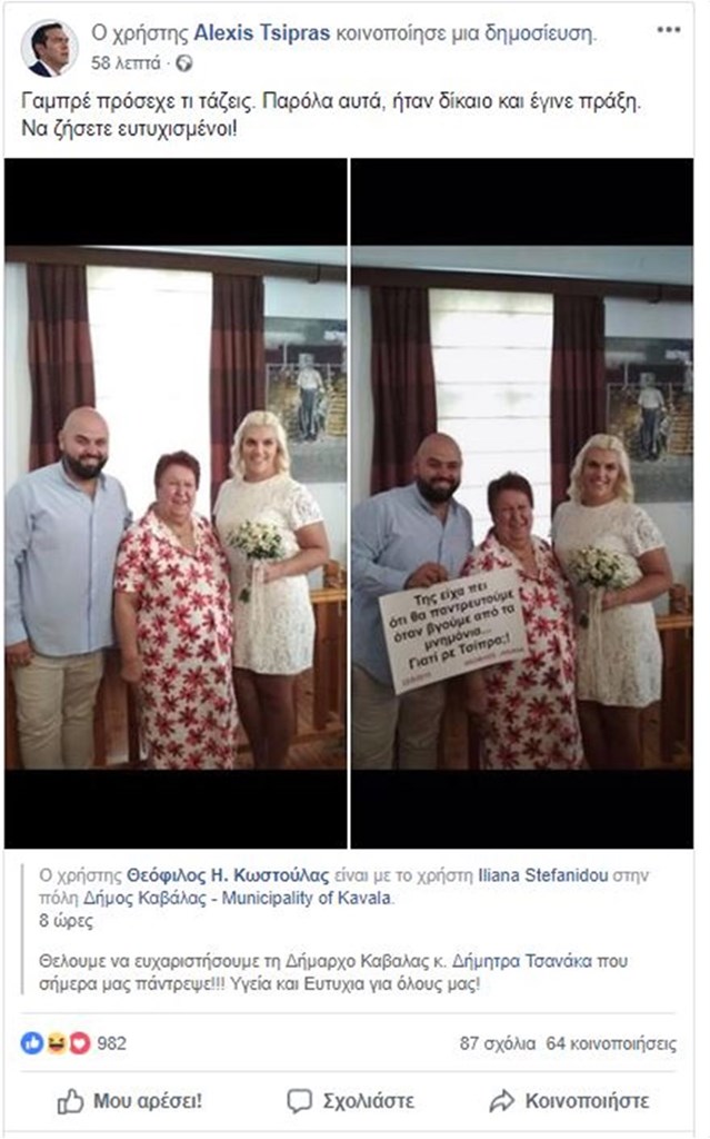 Με μια χιουμοριστική ανάρτηση στον προσωπικό λογαριασμό του στο Facebook ο Αλέξης Τσίπρας ευχήθηκε σε ένα ζευγάρι που παντρεύτηκε σήμερα στην Καβάλα.