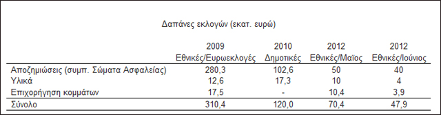 Παρατίθενται οι εκλογικές δαπάνες των κομμάτων σε σύγκριση με την αντίστοιχη περίοδο των ευρωεκλογών του 2009, των δημοτικών του 2010...
