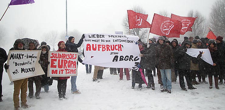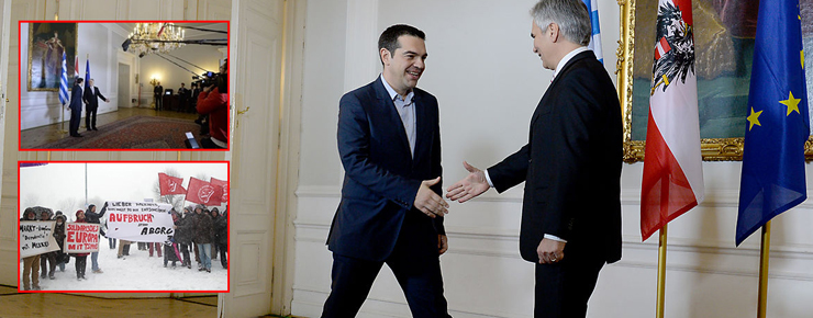 Τον κ. Τσίπρα υποδέχτηκαν στην πλατεία, μπροστά στο Μέγαρο της Καγκελαρίας, με έντονες επευφημίες, πολλές δεκάδες Ελλήνων και Αυστριακών, φωνάζοντας ενθουσιώδη συνθήματα και φέροντας πλακάτ στα οποία -μεταξύ άλλων- αναγραφόταν «ζητείται η διαγραφή χρέους στην Ελλάδα». Τους συγκεντρωμένους χαιρέτισε ο κ. Τσίπρας εκφράζοντας προς αυτούς τις ευχαριστίες του.