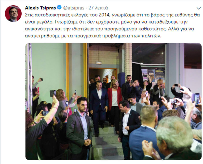 «Στις αυτοδιοικητικές εκλογές του 2014, γνωρίζαμε ότι το βάρος της ευθύνης θα είναι μεγάλο. Γνωρίζαμε ότι δεν ερχόμαστε μόνο για να καταδείξουμε την ανικανότητα και την ιδιοτέλεια του προηγούμενου καθεστώτος. Αλλά για να αναμετρηθούμε με τα πραγματικά προβλήματα των πολιτών», επεσήμανε ο πρωθυπουργός.