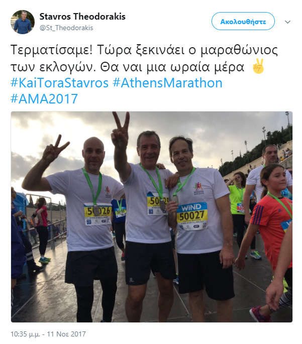 Μάλιστα ο επικεφαλής του Ποταμιού σχολιάζοντας στον προσωπικό λογαριασμό του στο Twitter , συνδύασε τον Μαραθώνιο της Αθήνας με τον «μαραθώνιο» των εκλογών για την Κεντροαριστερά. Συγκεκριμένα έγραψε: «Τερματίσαμε! Τώρα ξεκινάει ο μαραθώνιος των εκλογών. Θα ναι μια ωραία μέρα»