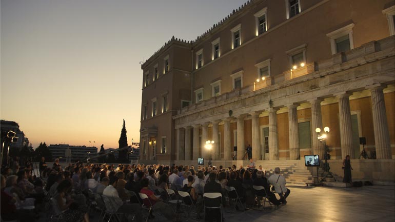 H Ζωή Κωνσταντοπούλου γιορτάζει την επέτειο των 41 ετών από την αποκατάσταση της Δημοκρατίας, στον προαύλιο χώρο της Βουλής, δίχως την παρουσία πολιτικών αρχηγών.
