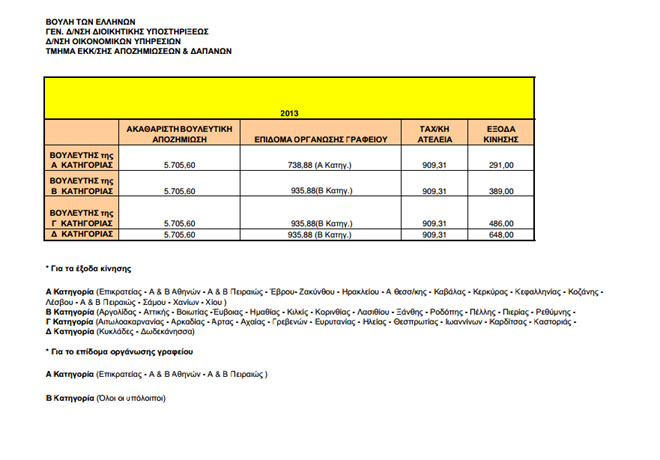 Σύμφωνα με αυτόν τον πίνακα, οι βουλευτές της Α Κατηγορίας έχουν λαμβάνειν 7.644,79 ευρώ, οι βουλευτές της Β Κατηγορίας 7.939,79 ευρώ, της Γ Κατηγορίας 8.036,79 ευρώ και της Δ Κατηγορίας 8.398,79 ευρώ. Ποσά διόλου ευκαταφρόνητα και ποσά τα οποία δεν περικόπηκαν ούτε κατά ένα ευρώ όχι μόνο η βουλευτική αποζημίωση, αλλά ούτε και το επίδομα οργάνωσης γραφείου, η ταχυδρομική ατέλεια, και φυσικά και τα έξοδα γραφείου. Παρά τις εκκλήσεις, λοιπόν, κάποιων εκ των μελών του Κοινοβουλίου έστω και για συμβολικές περικοπές.