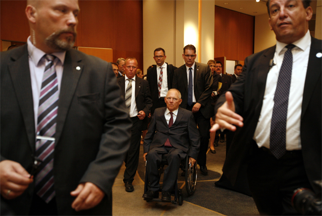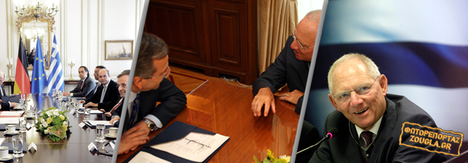 Ο υπουργός Οικονομικών της Γερμανίας, προσπάθησε να κλέψει την παράσταση ενόψει των γερμανικών εκλογών, ευλογώντας τα γένια του για την πετυχημένη συνταγή που εφήρμοσε στην Ελλάδα: τη σκληρή λιτότητα. Αφού απέδωσε τα εύσημα στην πολιτική ηγεσία, συναντήθηκε με μεγαλοτραπεζίτες, έκλεισε οποιοδήποτε παράθυρο κουρέματος του ελληνικού χρέους, υπέγραψε μνημόνιο συνεργασίας για τη δημιουργία του ελληνικού Ινστιτούτου Ανάπτυξης, άφησε ελπίδες για συζήτηση (;) όσον αφορά στο κατοχικό δάνειο, γεύτηκε φιλετάκι μοσχαριού και έφυγε πάλι για τη Γερμανία, κομίζοντας τα αιτήματα της ελληνικής πλευράς στην Καγκελάριο.