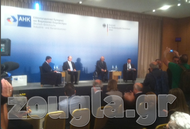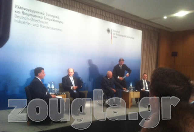 του τον κ. Στουρνάρα και εκ δεξιών τον κ. Χατζηδάκη (σ.σ. ευχαρίστησε την Μέρκελ για την στήριξη) έβαλε πρόωρο «φρένο» στη συζήτηση για νέο «κούρεμα» του ελληνικού χρέους. Κατά τη διάρκεια της εκδήλωσης του Ελληνογερμανικού Εμπορικού και Βιομηχανικού Επιμελητηρίου, τόνισε ότι αναγνωρίζει τις προσπάθειες που καταβάλλονται, προκειμένου η χώρα να εξέλθει από την κρίση, καλώντας τις ελληνικές αρχές να συνεχίσουν τον αγώνα τους, βάσει των συμφωνηθέντων. «Να μη συνεχίσετε τη συζήτηση για νέο κούρεμα. Δεν είναι προς όφελός σας», δήλωσε χαρακτηριστικά, ενώ σε άλλη αποστροφή του λόγου του είπε ότι το πρόγραμμα για «κούρεμα» του χρέους, χωρίς άλλα μέτρα, μόνον μεταθέτει το πρόγραμμα στις επόμενες γενιές.