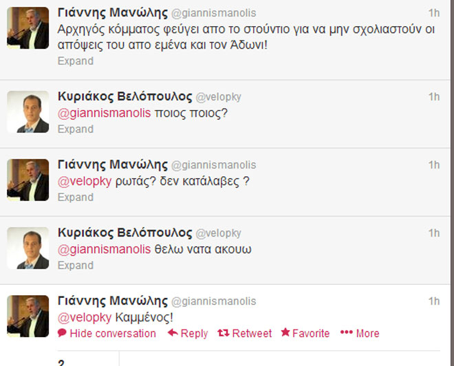 Προφανώς ο κ. Καμμένος υπονόησε πως θα έπρεπε να ήταν ο μοναδικός συνομιλητής του Μάκη Τριανταφυλλόπουλου και πως δεν θα υπήρχε ουδείς στο στούντιο για να σχολιάσει τα λεγόμενά του. Αμέσως μετά ο Πάνος Καμμένος αποχώρησε με τη συνοδεία του.