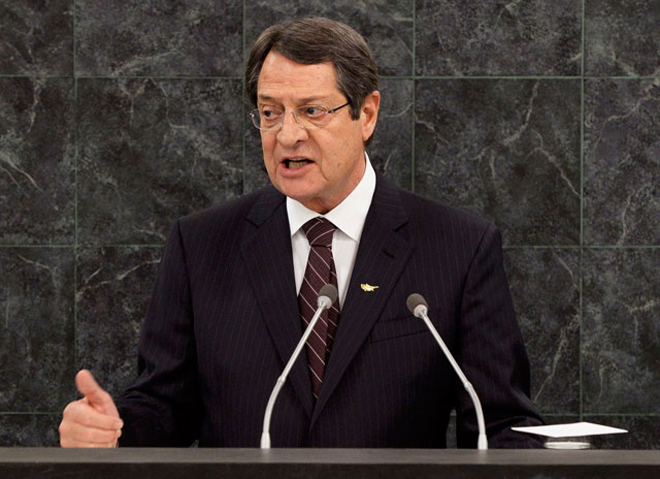 Αναφερόμενος στο Κυπριακό, ο Πρόεδρος της Δημοκρατίας διαβεβαίωσε ότι «παρά τις τρέχουσες οικονομικές δυσκολίες που αντιμετωπίζουμε, είμαι αποφασισμένος όπως εργαστώ ακούραστα και με αποφασιστικότητα για την επίτευξη μιας βιώσιμης και διαρκούς διευθέτησης, ούτως ώστε όλες οι κοινότητες της Κύπρου να ζήσουν και να ευημερήσουν σε μια σύγχρονη ευρωπαϊκή χώρα, η οποία να σέβεται πλήρως τις αρχές και αξίες των Ηνωμένων Εθνών και της ΕΕ, να εξασφαλίζει τις θεμελιώδεις ελευθερίες και ανθρώπινα δικαιώματα όλων των πολιτών της και να διασφαλίζει την ειρηνική συνύπαρξη και ευημερούσα συνεργασία τους».