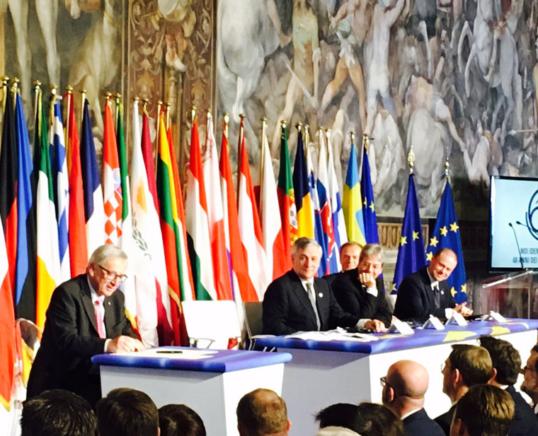 «Πρέπει να είμαστε περήφανοι για την Ευρώπη», δήλωσε ο πρόεδρος της Ευρωπαϊκής Επιτροπής, Ζαν Κλοντ Γιούνκερ, μιλώντας πριν την έναρξη της τελετής για την υπογραφή της Διακήρυξης της Ρώμης.