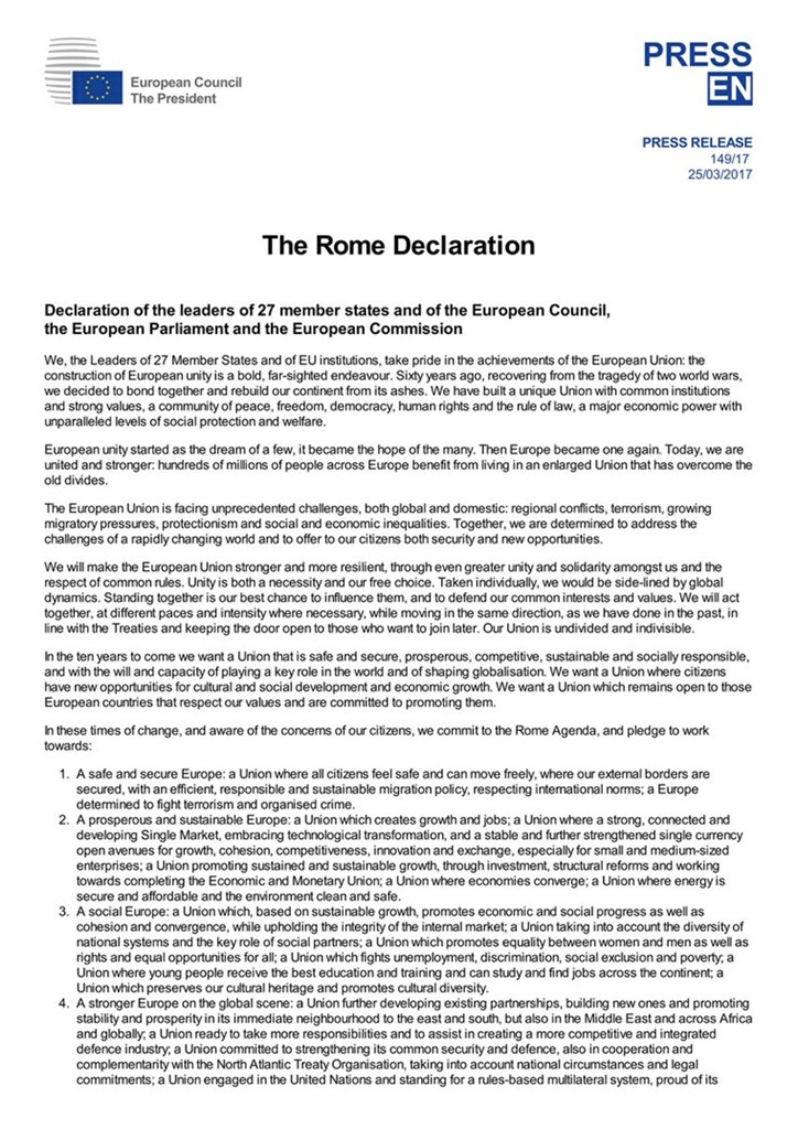Η Σύνοδος της Ρώμης πάντως δεν είναι παρά τη αρχή της διαδρομής ώστε να αποφασιστεί το μέλλον της Ε.Ε., με διετή ορίζοντα, έως τις επόμενες ευρωεκλογές, που είναι προγραμματισμένες για τον Ιούνιο 2019.