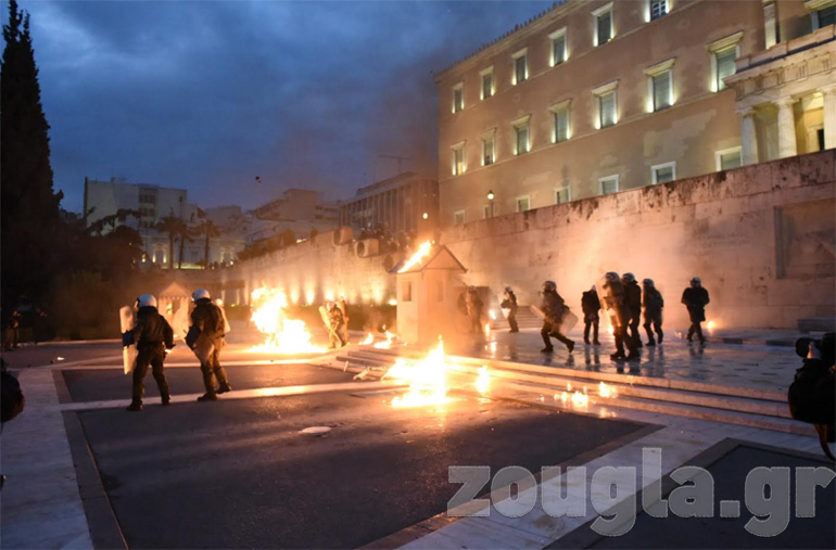 Νεαροί διαδηλωτές με κοκτέιλ μολότοφ επιτέθηκαν κατά του φυλακίου των ευζώνων στον Άγνωστο Στρατιώτη, στη συνέχεια απωθήθηκαν με χημικά από τα ΜΑΤ και κάπως έτσι άρχισε ένα κυνηγητό μεταξύ αστυνομικών και διαδηλωτών που διήρκεσε με εξάρσεις για αρκετές ώρες.