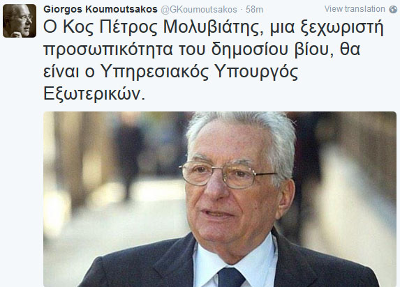 «Ο Κος Πέτρος Μολυβιάτης, μια ξεχωριστή προσωπικότητα του δημοσίου βίου, θα είναι ο Υπηρεσιακός Υπουργός Εξωτερικών» έγραψε ο κ. Κουμουτσάκος στον προσωπικό του λογαριασμό στο Τwitter.
