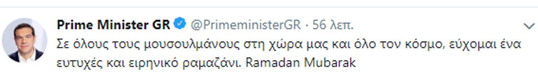 «Σε όλους τους μουσουλμάνους στη χώρα μας και όλο τον κόσμο, εύχομαι ένα ευτυχές και ειρηνικό ραμαζάνι. Ramadan Mubarak» αναφέρει ο πρωθυπουργός.