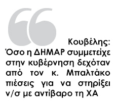 Αιχμές για τον πρώην γενικό γραμματέα της κυβέρνησης άφησε ο πρόεδρος της ΔΗΜΑΡ Φώτης Κουβέλης, δηλώνοντας ευθέως χθες το βράδυ, κατά την παρουσίαση του βιβλίου του Χάρη Καστανίδη, ότι όσο η ΔΗΜΑΡ συμμετείχε στην κυβέρνηση δεχόταν από τον κ. Μπαλτάκο πιέσεις για να στηρίξει νομοσχέδια με αντίβαρο τη Χρυσή Αυγή.