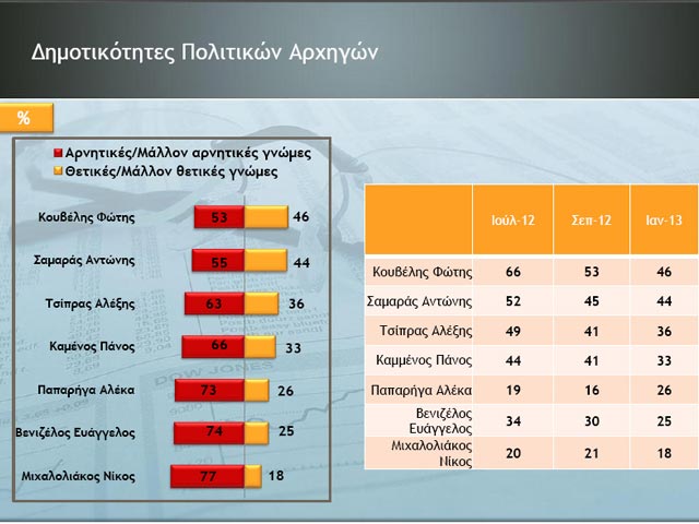 Στη δημοτικότητα των αρχηγών, ψηλά -αν και με μειωμένο ποσοστό- παραμένει ο Φώτης Κουβέλης (46% θετικές γνώμες) και ακολουθεί ο Αντώνης Σαμαράς με 44% και ο Αλέξης Τσίπρας με 36%.