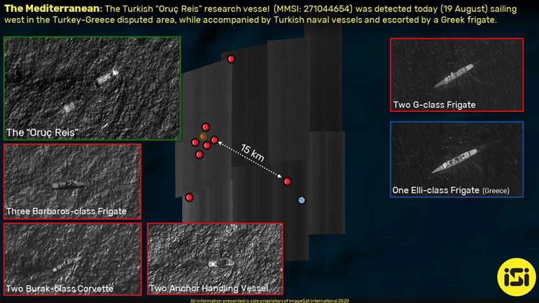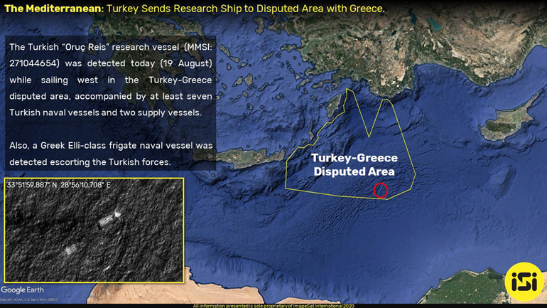 Η ισραηλινή εταιρεία «Image Satellite Intelligence» που παρέχει υπηρεσίες παρακολούθησης από τρεις στρατιωτικούς δορυφόρους (Knight, Runner και Sprinter) στους πελάτες της ανάρτησε στο Twitter πριν από 15 ώρες δύο φωτογραφίες και ένα ενημερωτικό σχεδιάγραμμα από τις κινήσεις του τουρκικού σκάφους Oruc Reis στην Ανατολική Μεσόγειο.